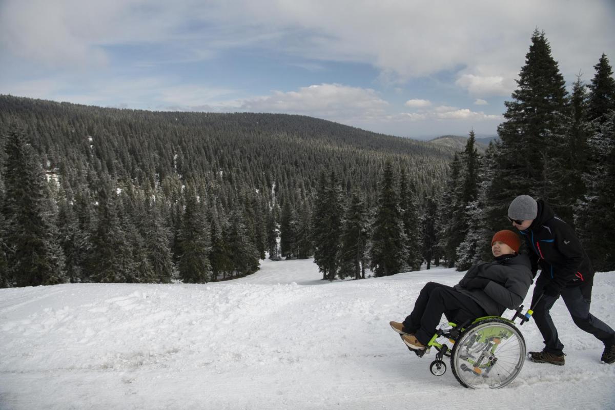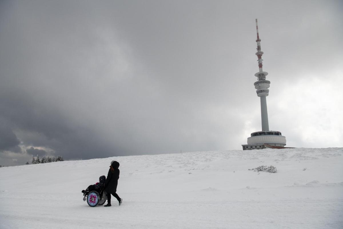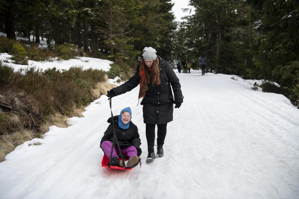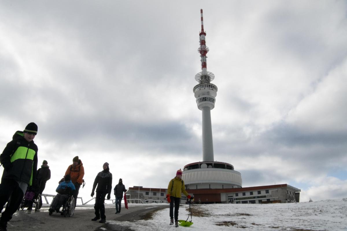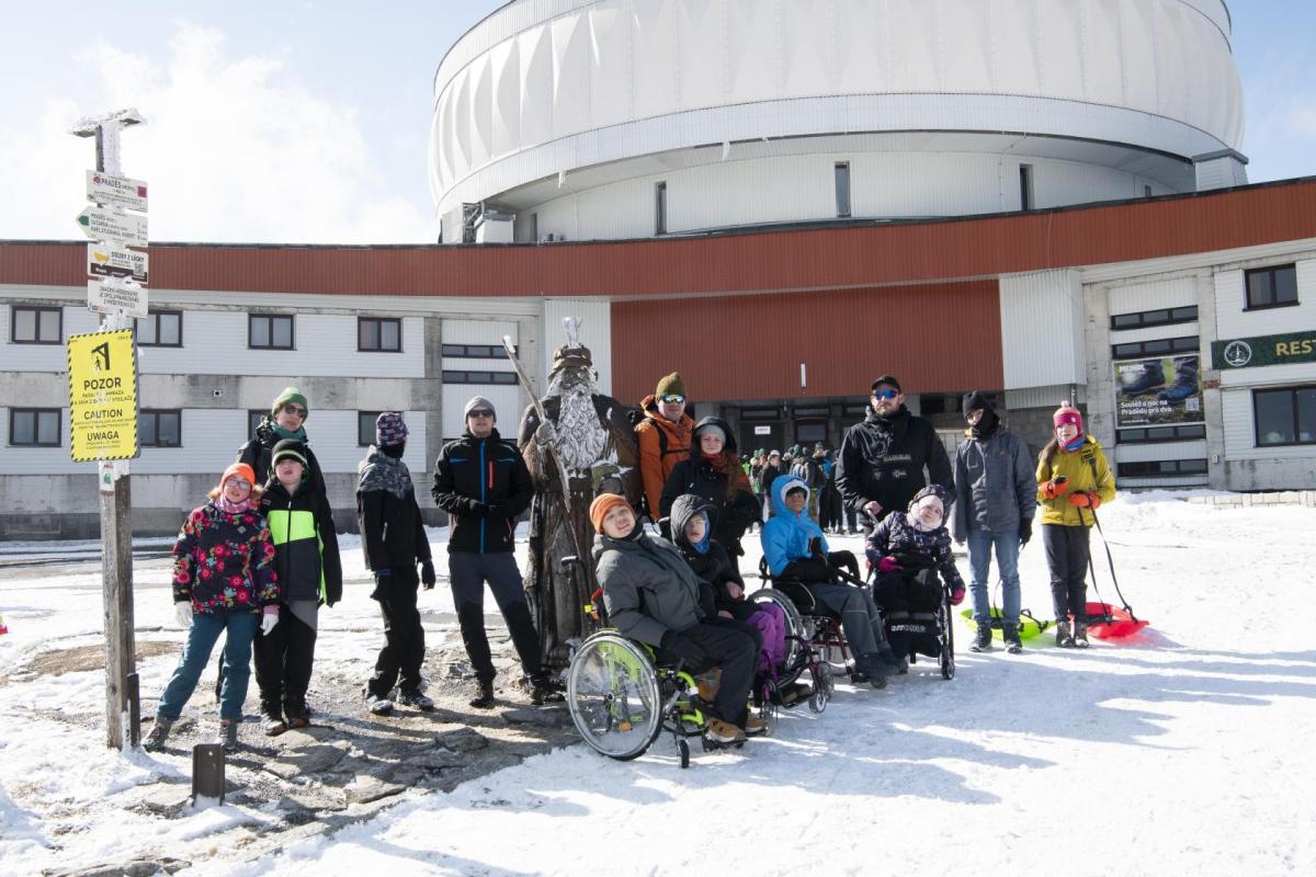 Na Ovčárně přebalíme batohy, zapřáhneme "plastové saně" a vyrážíme. Od Horské služby přes Petrovy boudy a rozcestí Praděd stoupáme na vrchol. Cesta je celkem náročná, sníh je měkký a kolečka vozíku se boří hluboko do sněhu. Postupně dolaďujeme nejlepší způsoby výstupu - jeden jede na bobech, druhý a třetí na vozíku popředu, čtvrtý na vozíku pozadu, ostatní po svých. Ve 13:30 konečně stojíme na nejvyšším vrcholu Moravy, na Pradědu (1491 m.n.m). Jen co se zaslouženě a vydatně občerstvíme, užíváme si překrásné výhledy na Petrovy kameny, Dlouhé stráně nebo Kralický Sněžník. Z Pradědu nás čeká dlouhý sestup na Švýcárnu. Malebná chata nás vítá stylovými pokojíčky a výtečnou domácí kuchyní. Personál je tam tak skvělý, že se u nich cítíme jako doma. Zatímco se děti po dnešním náročném dnu pomalu ukládají ke spánku, ladíme zítřejší program.